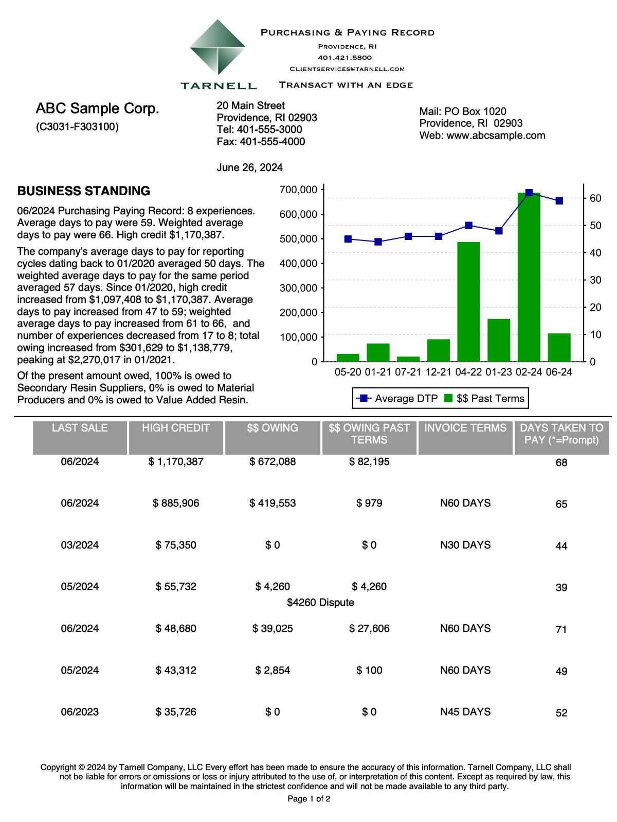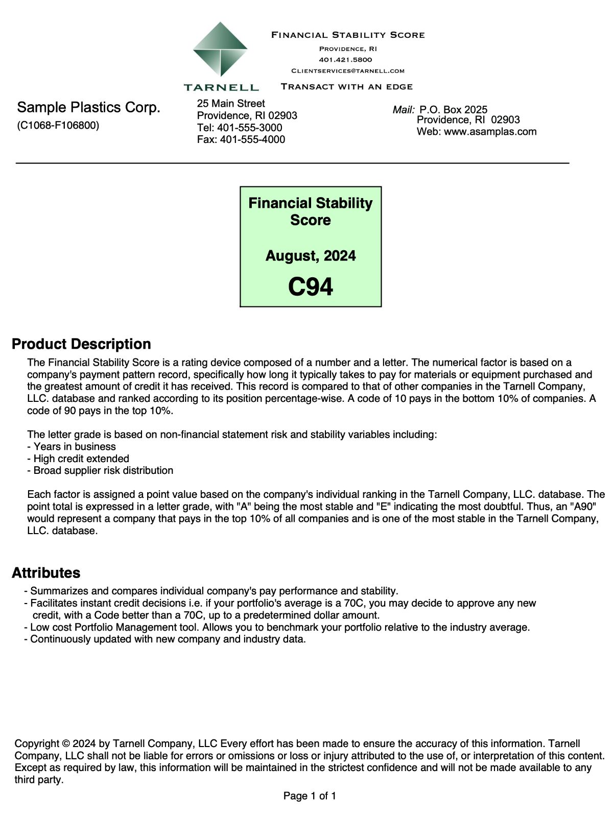 Available as a standalone report, the Score combines verified and raw trade payment data reported to Tarnell with a unique set of operational details to produce an alphanumeric score. This helps users make informed decisions about a company’s potential stability.